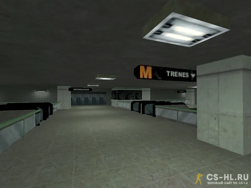 Карта de_metro для CS 1.6 это не самая большая по размерам игрового пространства карта, на которой в соответствии с названием, представлена станция подземки. Вернее, большее внимание на локации отведено трем каскадам эскалаторов, следовательно, сражение терров со спецназом будет происходить на трех высотных уровнях. Самый нижний - перрон со схематично обозначенными путями, средний - переходы и террасы над перроном, и верхний - при выходе из метро.